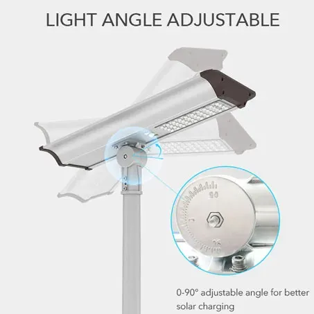 Solar street lights with 90° adjustable arm, it can be easily mounted on a pole (pole diameter 60mm, recommended mounted height 4-5m)