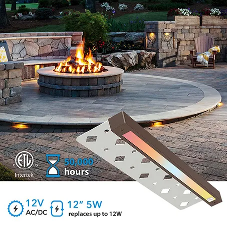 This ETL listed 12 inch 5cct low voltage Retaining Wall Lights delivers 450lm of soft white light while only using 5W of power. Bad weather won't be an issue for this light thanks to the IP65 waterproof rating while the downward shine perfectly lights your decks, barbecue fire pits, landscape steps, flowerbeds, and masonry walls.