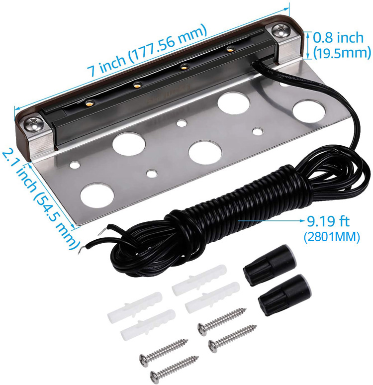The stainless steel plate's width can be adjusted by cutting along the dotted line. This makes installation very convenient. The aluminum light bar is detachable, and the package includes mounting accessories and waterproof wire connectors that are only compatible with 16AWG and 18AWG wires.