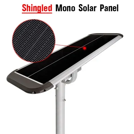 Outdoor solar street light use shingled monocrystalline silicon photovoltaic panels with the high photoelectric conversion efficiency up to 30%. Thw 60w solar light outdoor built-in 36000mAh large capacity lithium battery, to be fully charged in only 6-8 hours, providing a long working time about 6-7 rainy days.