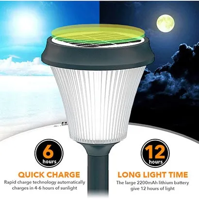 Rechargeable 2200mAh lithium battery, with 6V/2WP monocrystal silicon solar panel, it needs about 4-6 hours full sun exposure and will supply more than 12 hours continuously lighting time at night.