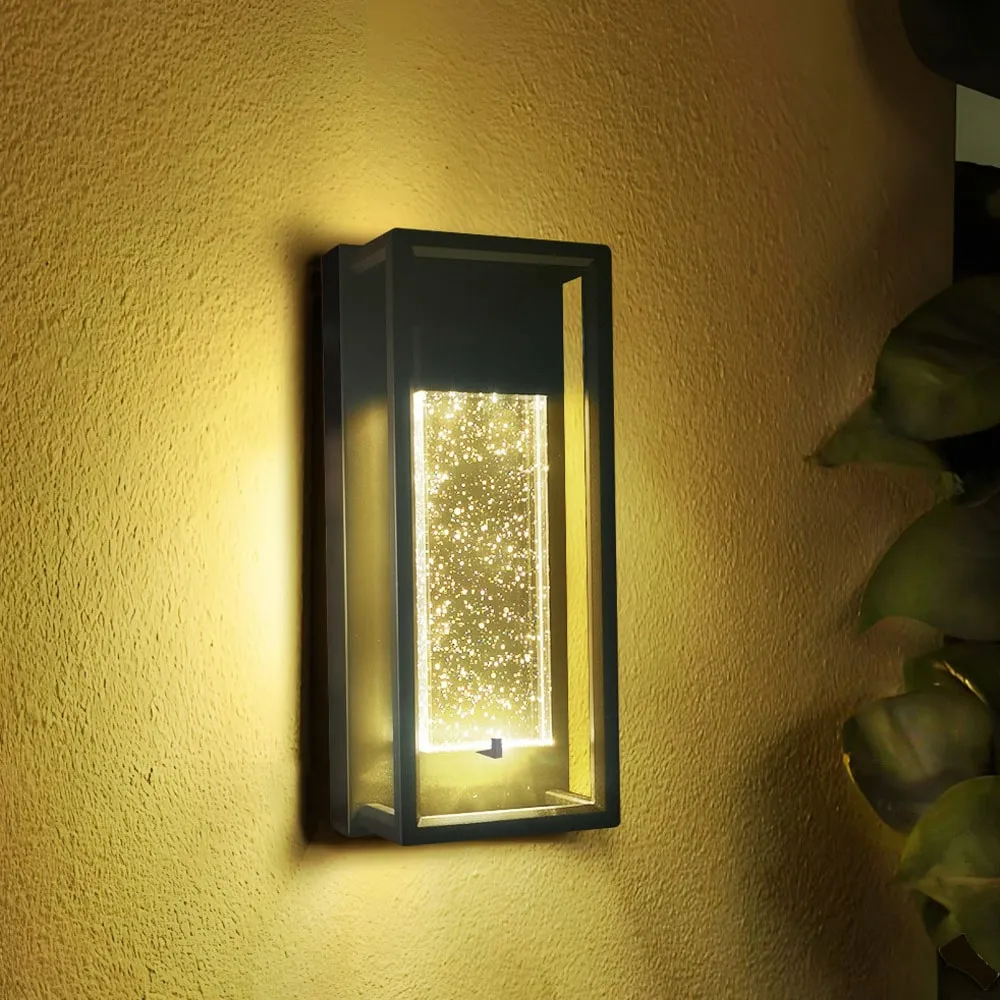 This wall light is a modern design with a dark bronze finish. The lantern frame matches the clear seeded glass tube, and the soft light that goes through the lamp makes your home brighten in style. Made of metal and glass, this outdoor wall lantern is well-tolerated in a variety of outdoor weather conditions, perfect for your garage, porch, patio, or veranda.
