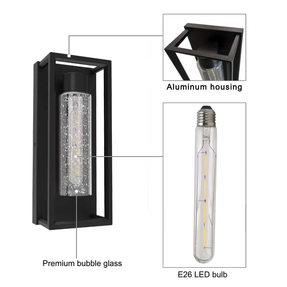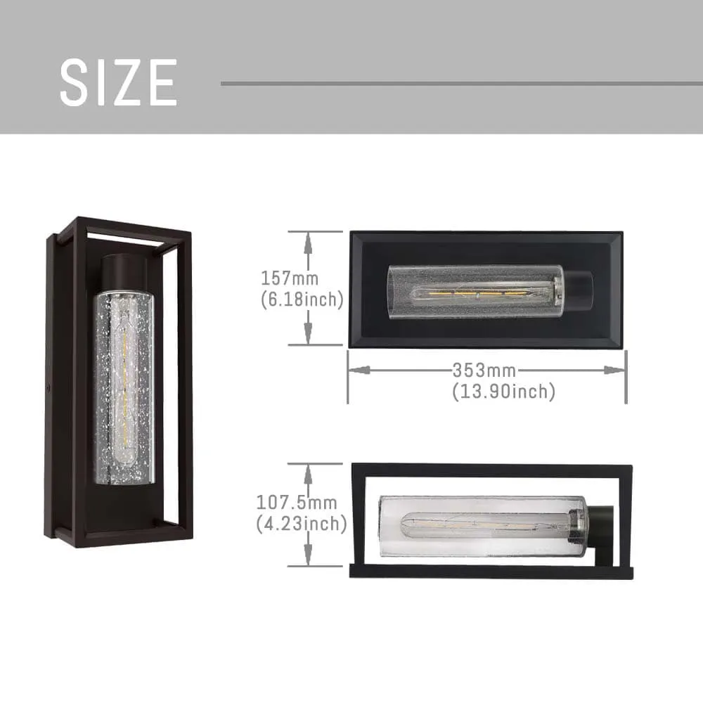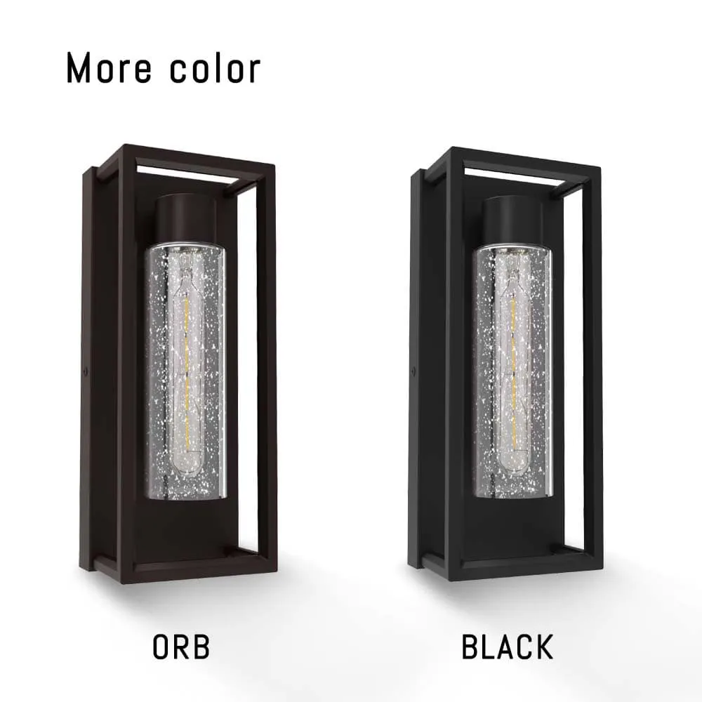 This wall light is a modern design with a dark bronze finish. The lantern frame matches the clear seeded glass tube, and the soft light that goes through the lamp makes your home brighten in style. Made of metal and glass, this outdoor wall lantern is well-tolerated in a variety of outdoor weather conditions, perfect for your garage, porch, patio, or veranda.